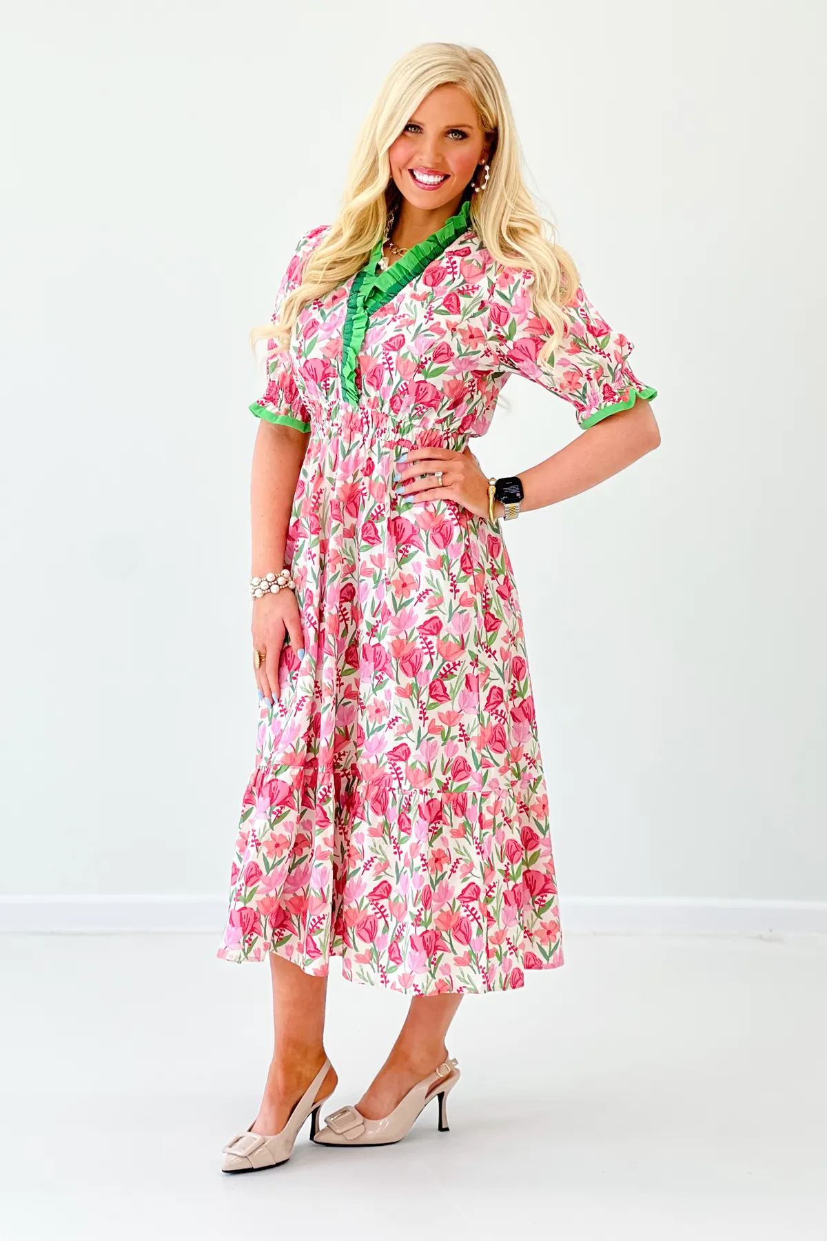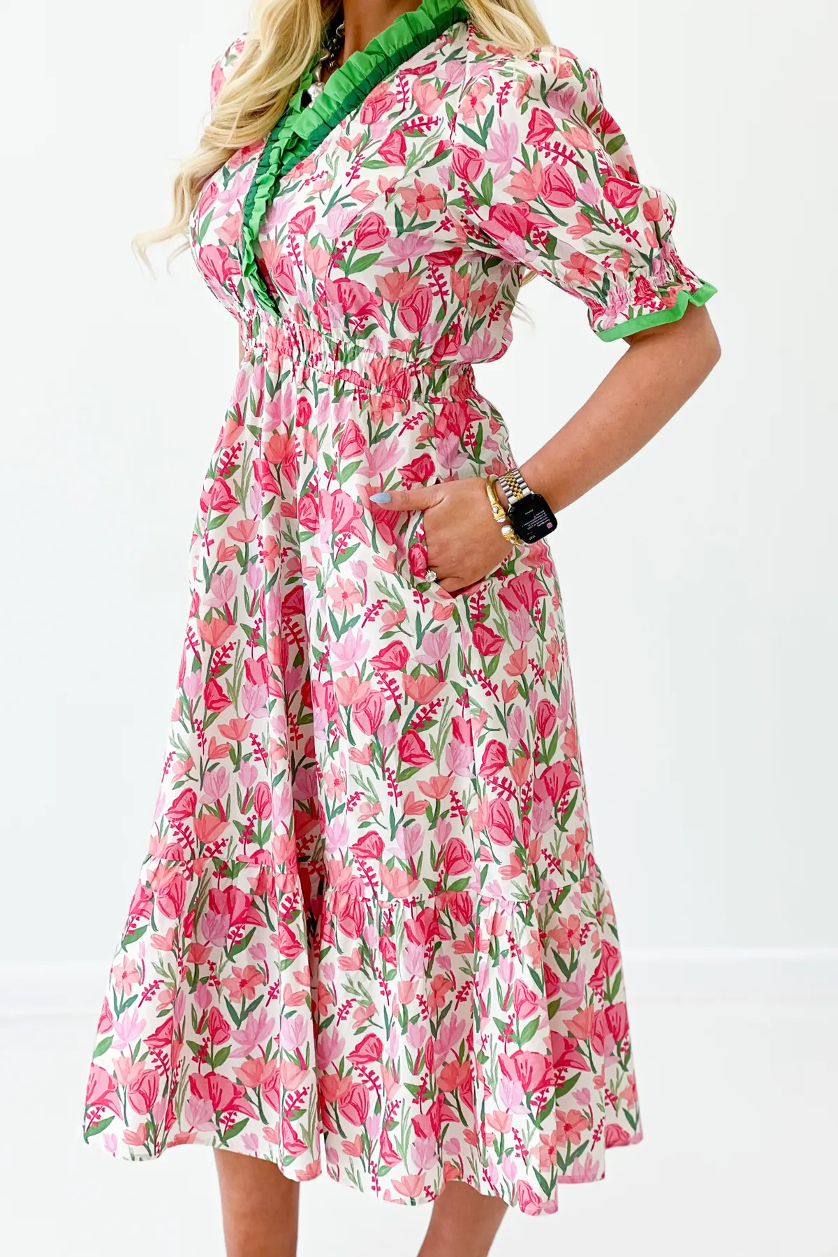 Pink Mix Abstract Print Lace Trim Midi Dress