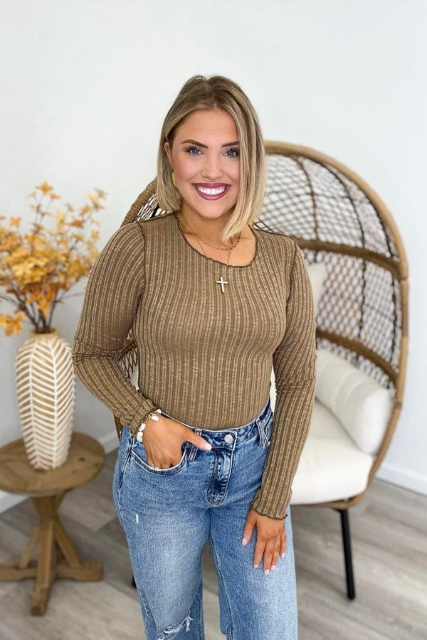 Mocha Mousse Raw Edge Detail Long Sleeve Top