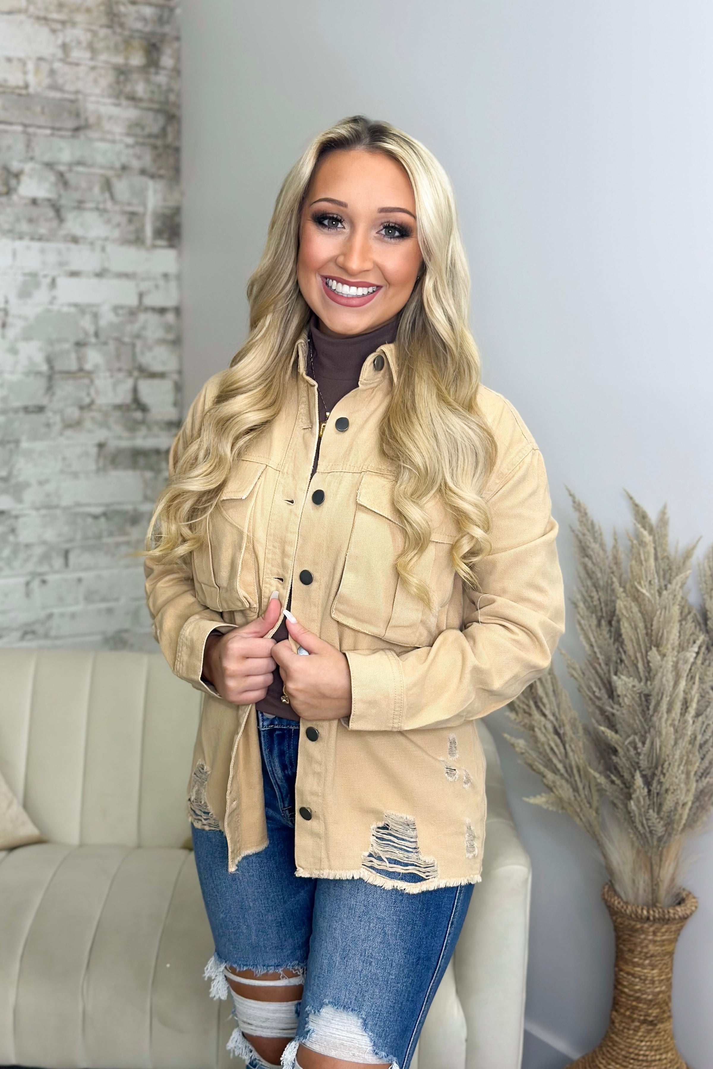 Beige Taupe Distressed Button Up Jacket