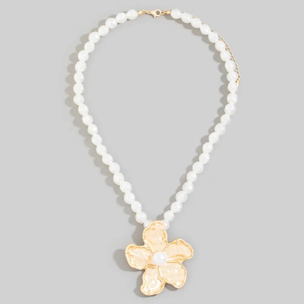 Pendant necklace featuring a hammered flower design with pearl bead accents.