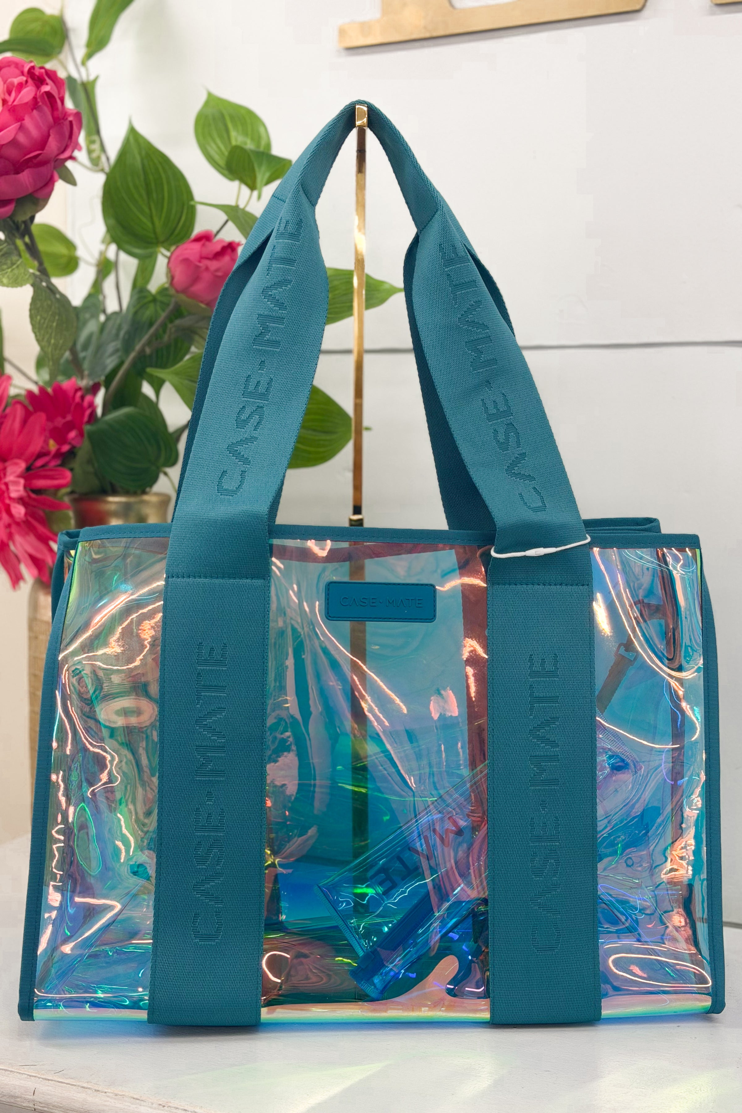Iridescent jelly tote bag with water-repellent finish for beach and vacation