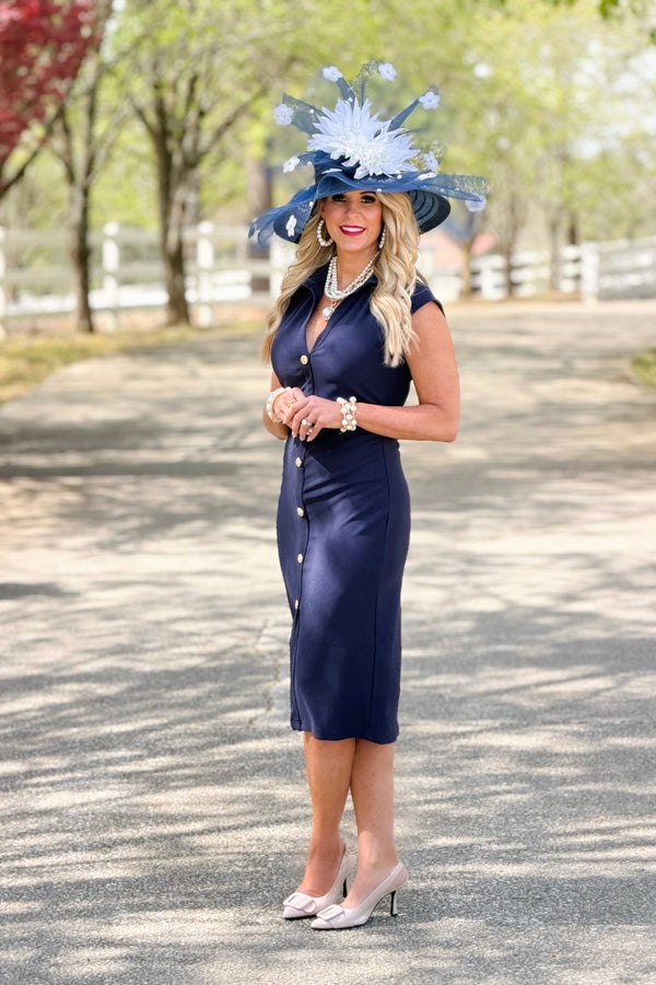 Navy Cap Sleeve V-Neck Button Detail Dress