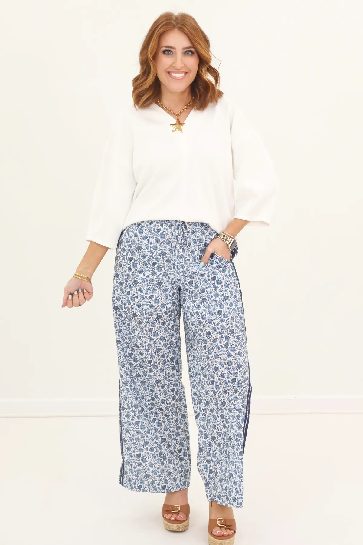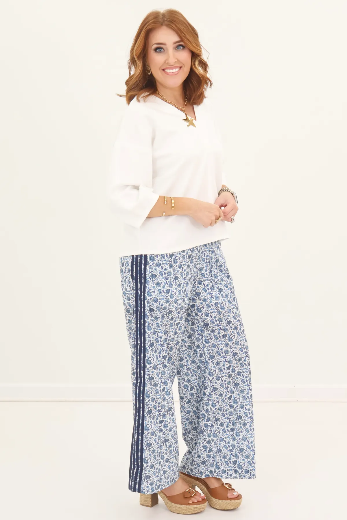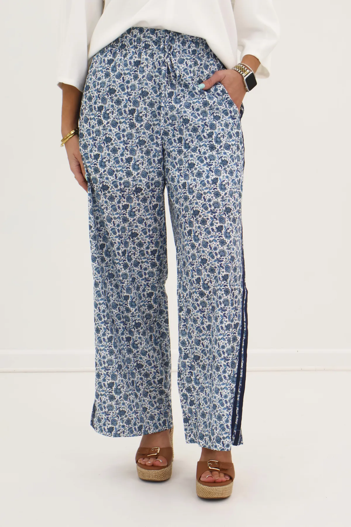 White Floral Striped Detail Pant