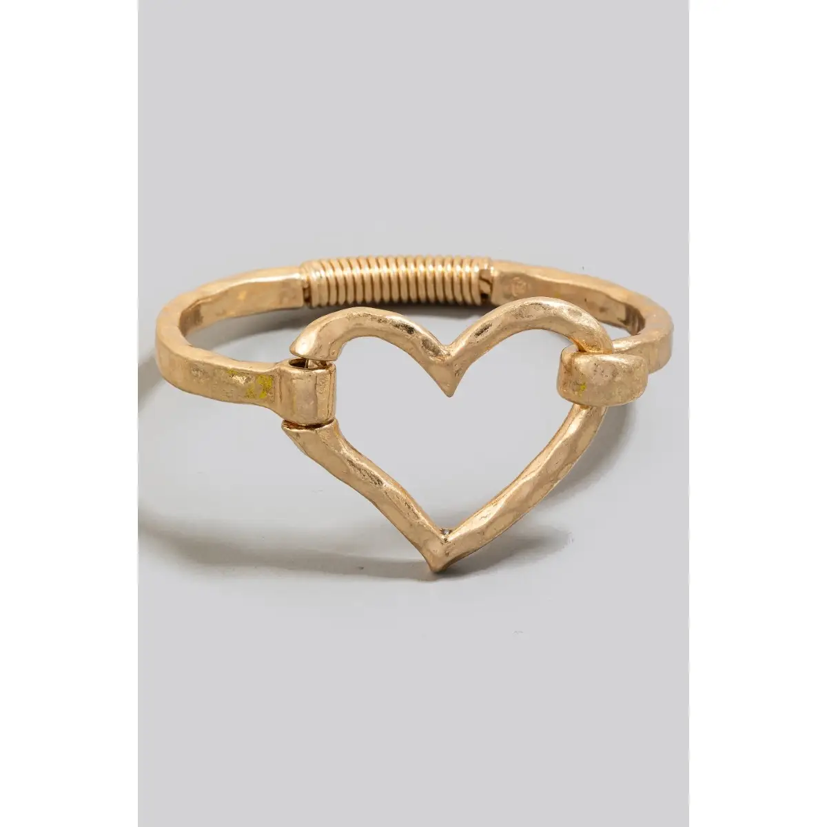 Hammered alloy bangle bracelet featuring a heart-shaped coil spring hook closure.