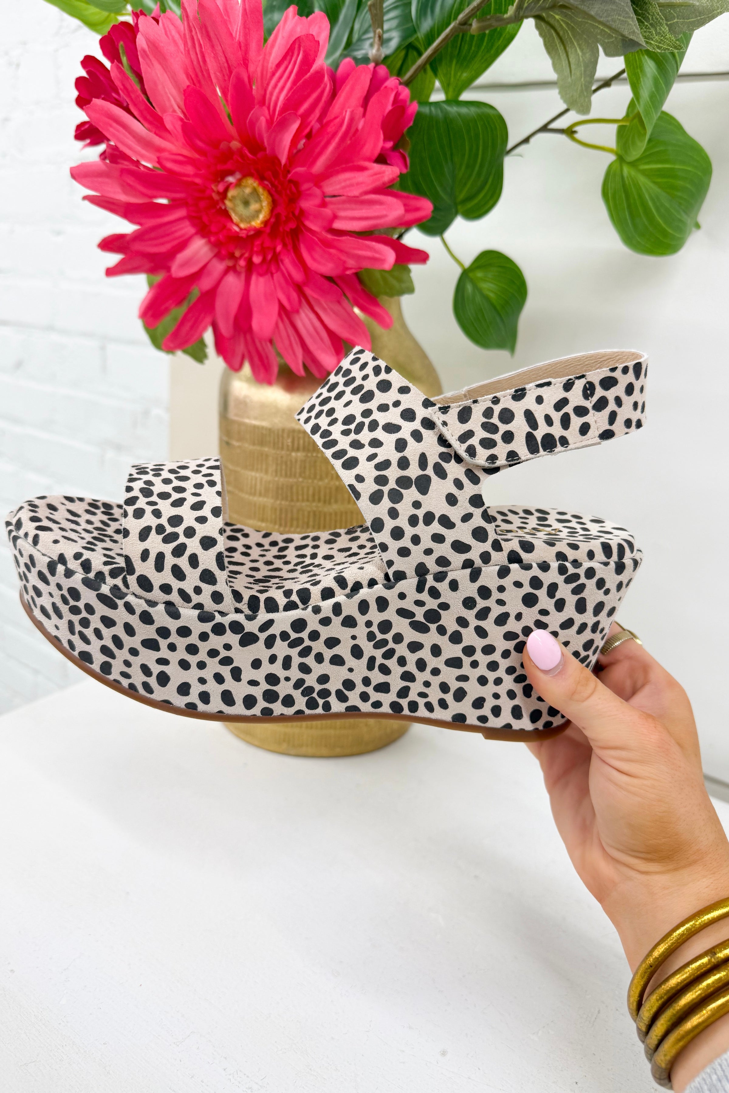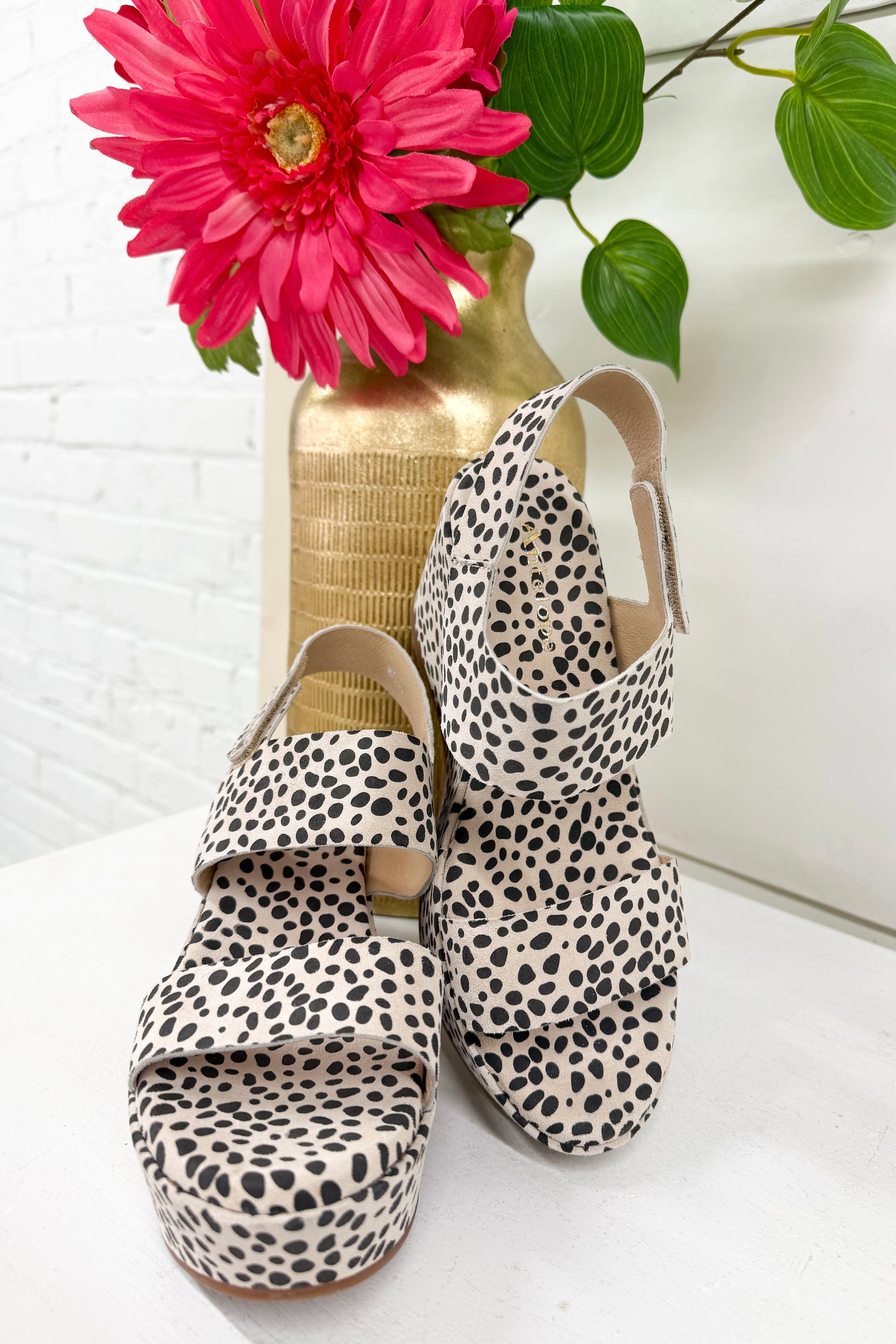 The Jill women's leopard print platform sandals ankle strap comfort style pairs bold leopard pattern with refined European craftsmanship. The upper is made of fine quality suede, giving the strappy silhouette a soft, feminine texture that balances the daring print. A 2.5 inch platform height creates a flattering lift, while the cushioned latex insole — coated in smooth, breathable leather — delivers genuine all-day comfort. The adjustable ankle closure ensures a secure, personalized fit, and the Make Up tone keeps the look effortlessly versatile from weekend markets to evening plans.