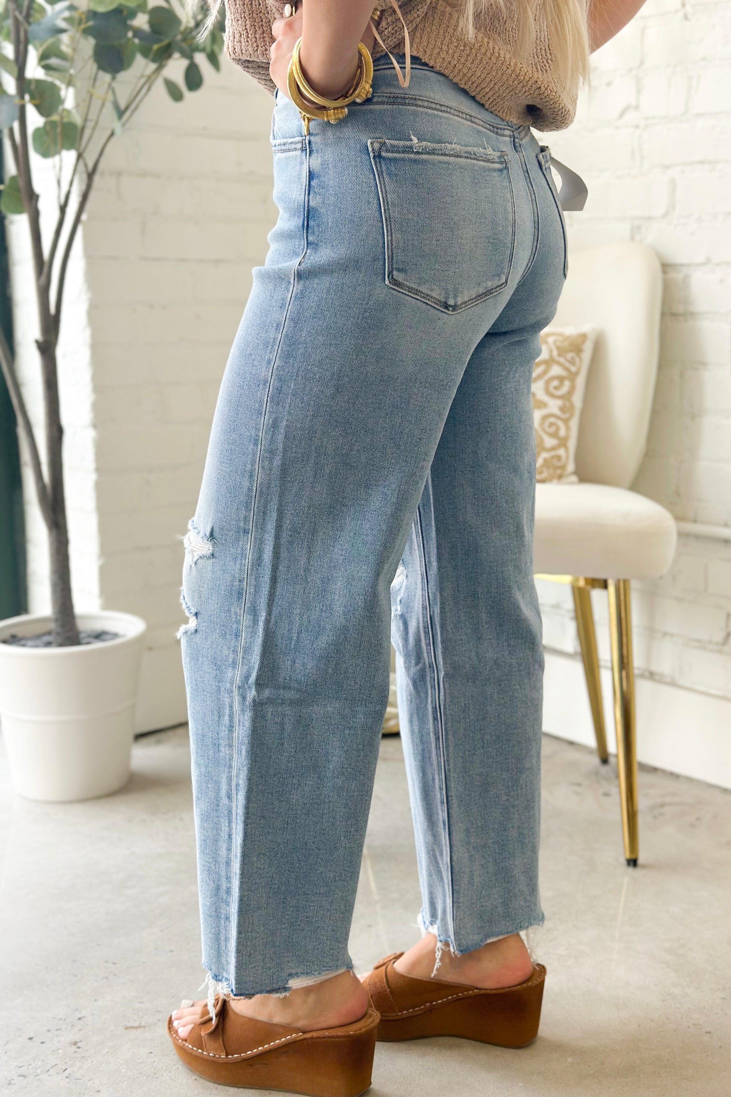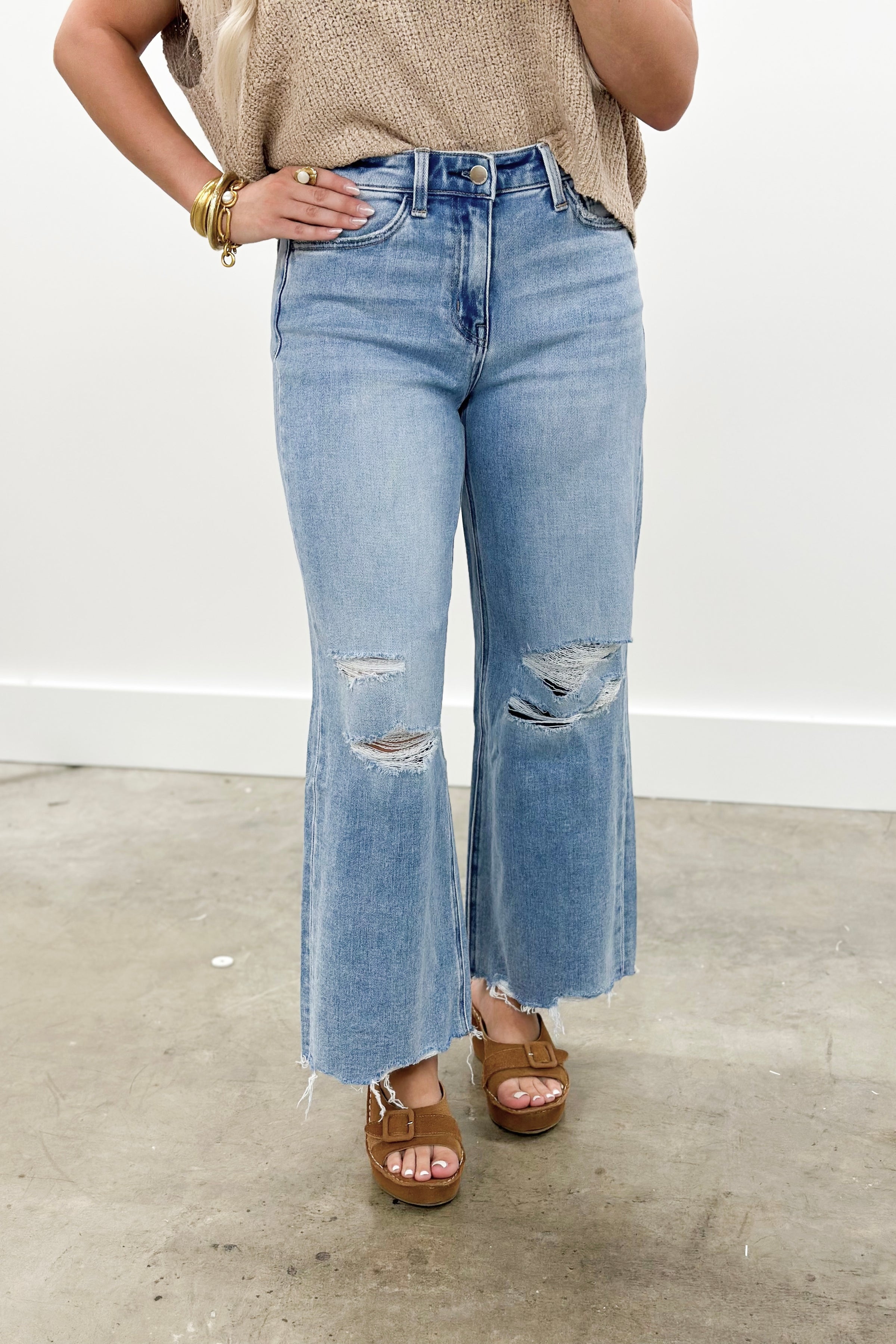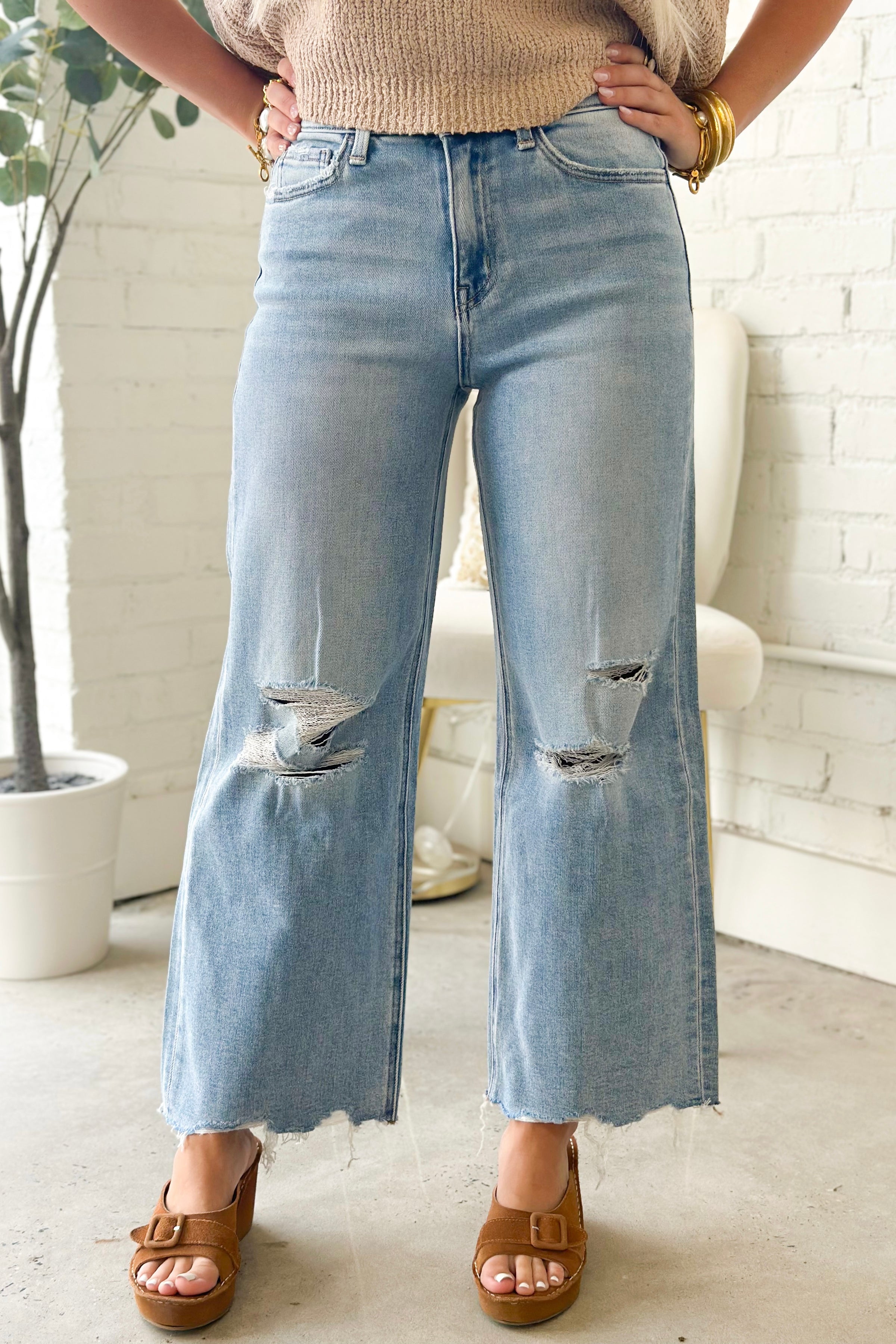 Comfort stretch denim, high rise waist, distressed detail, raw hem, cropped length, wide jeans.