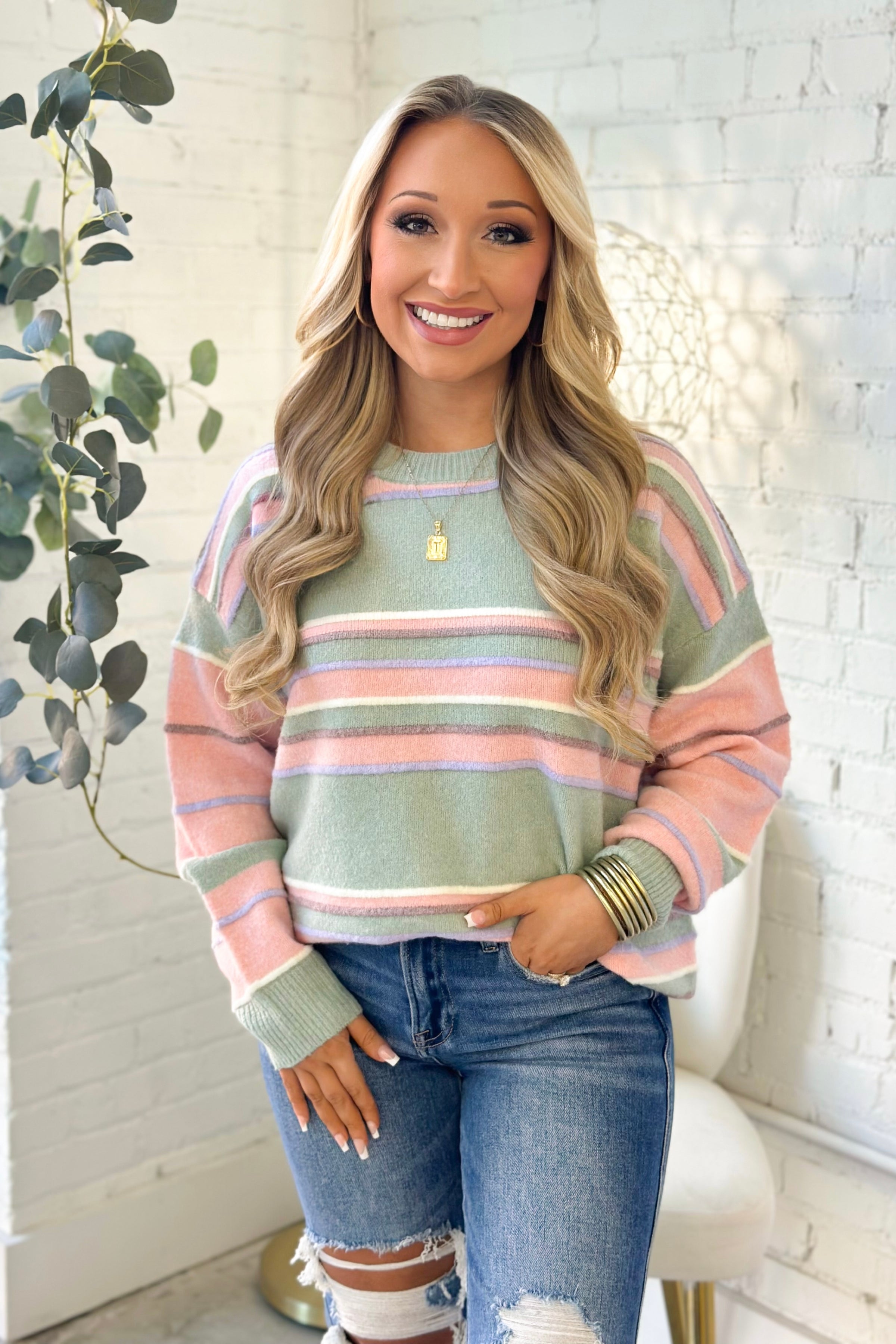 Sage Combo Mixed Stripe Long Sleeve Sweater