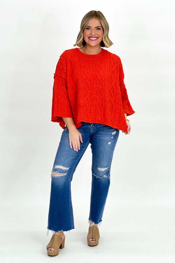 Hot Coral Round Neck 3/4 Sleeve Crop Sweater
