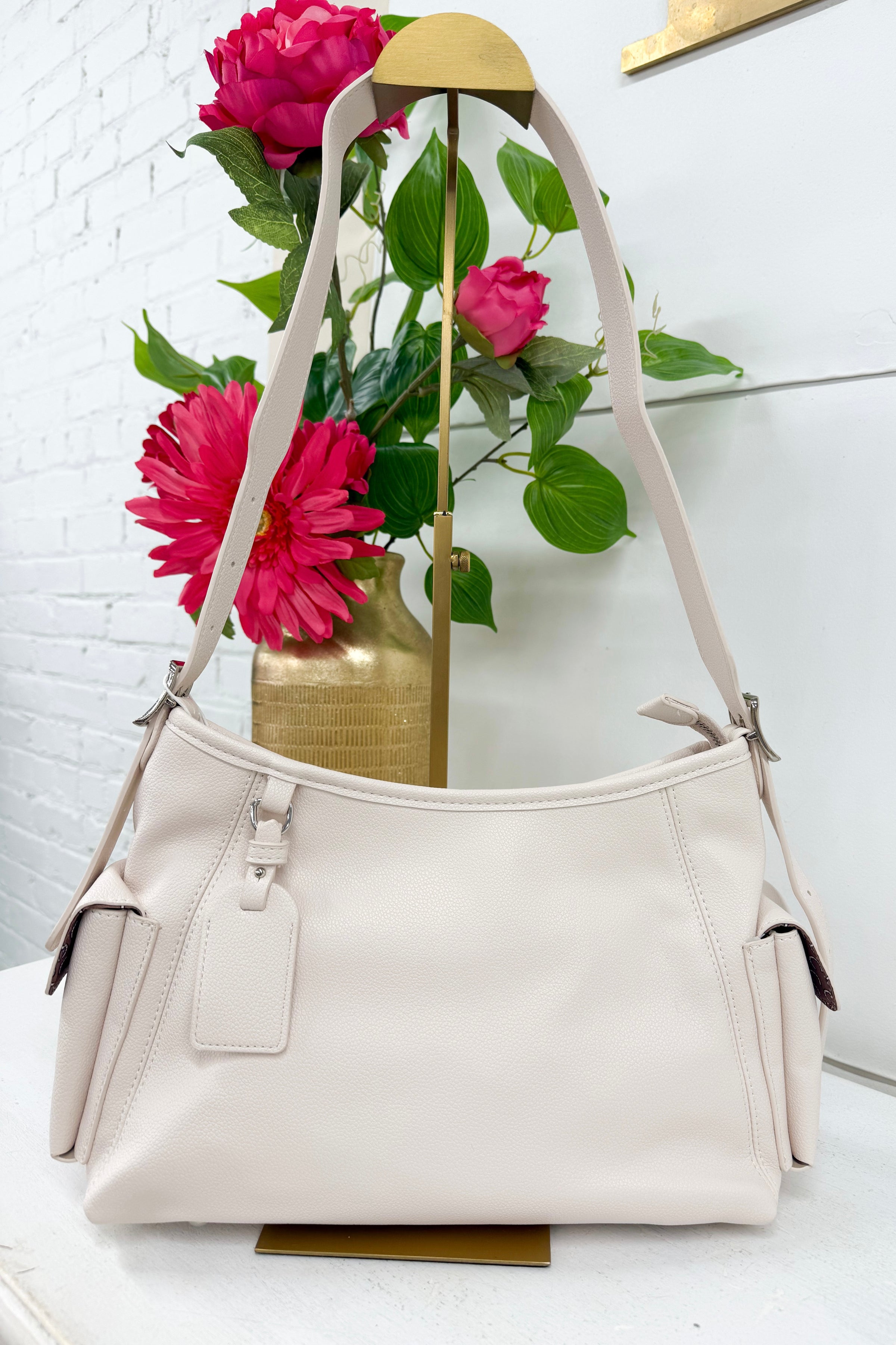 Cargo-style shoulder bag with multiple exterior pockets and an adjustable strap