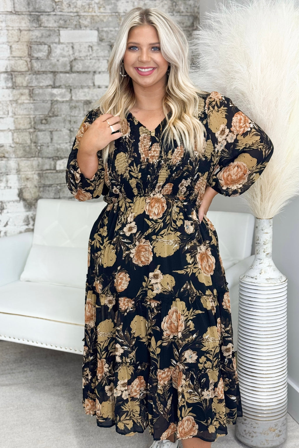Black Floral Print Smocked Long Sleeve Dress