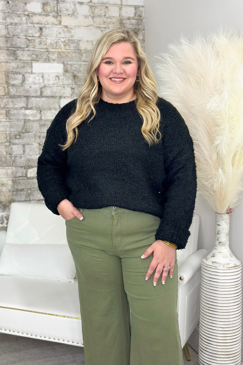 Black Boucle Knit Pullover Sweater