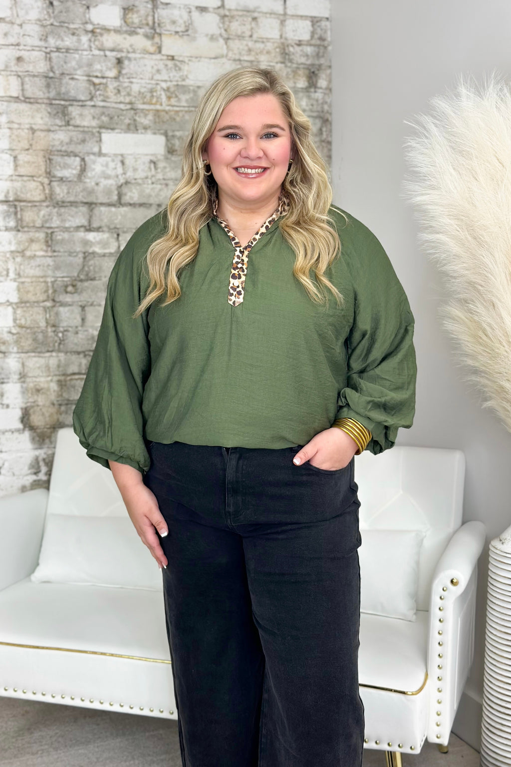 Olive Balloon Sleeve Detail Trim Top