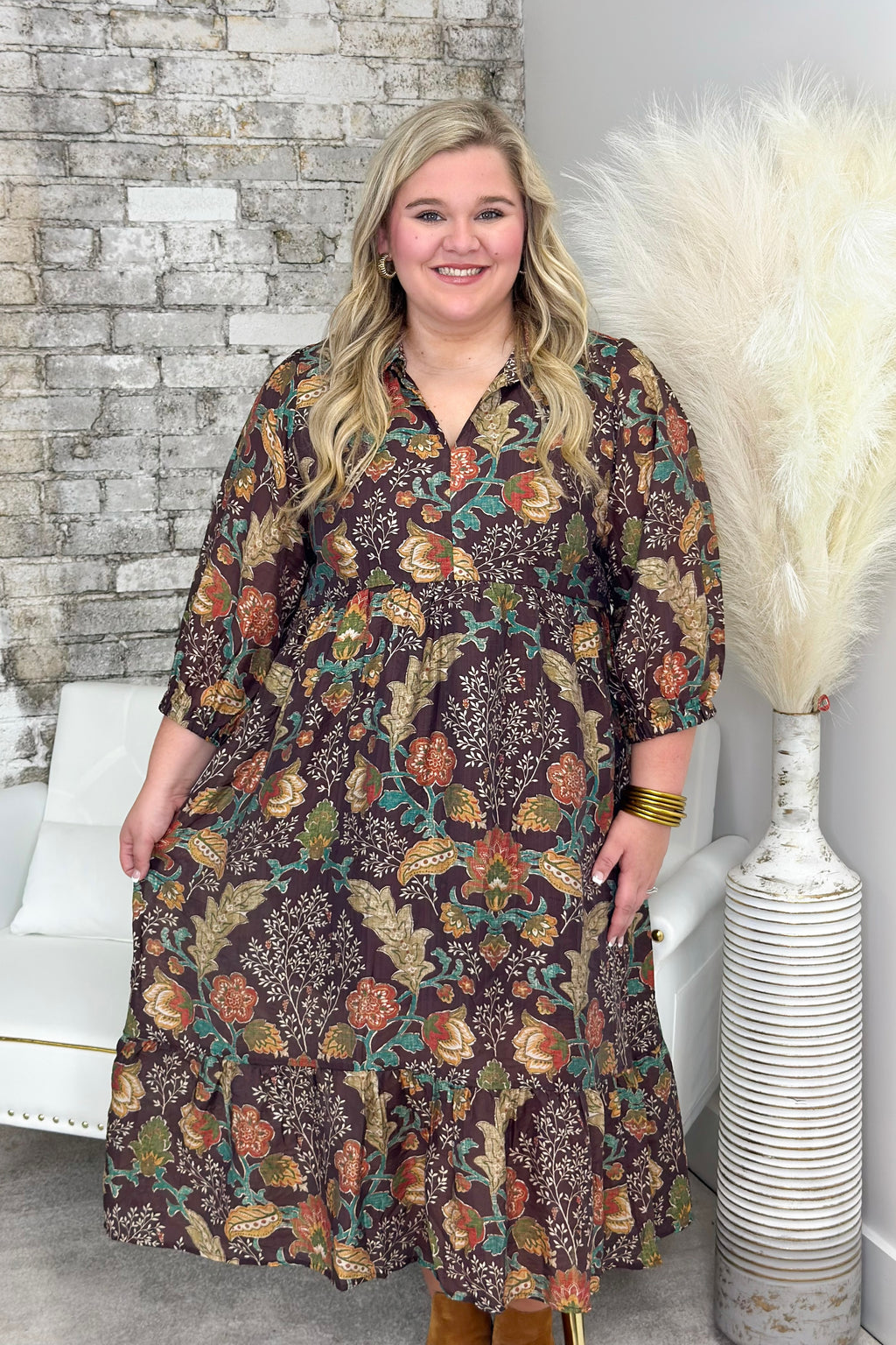 Brown Mix Floral Collared Midi Dress