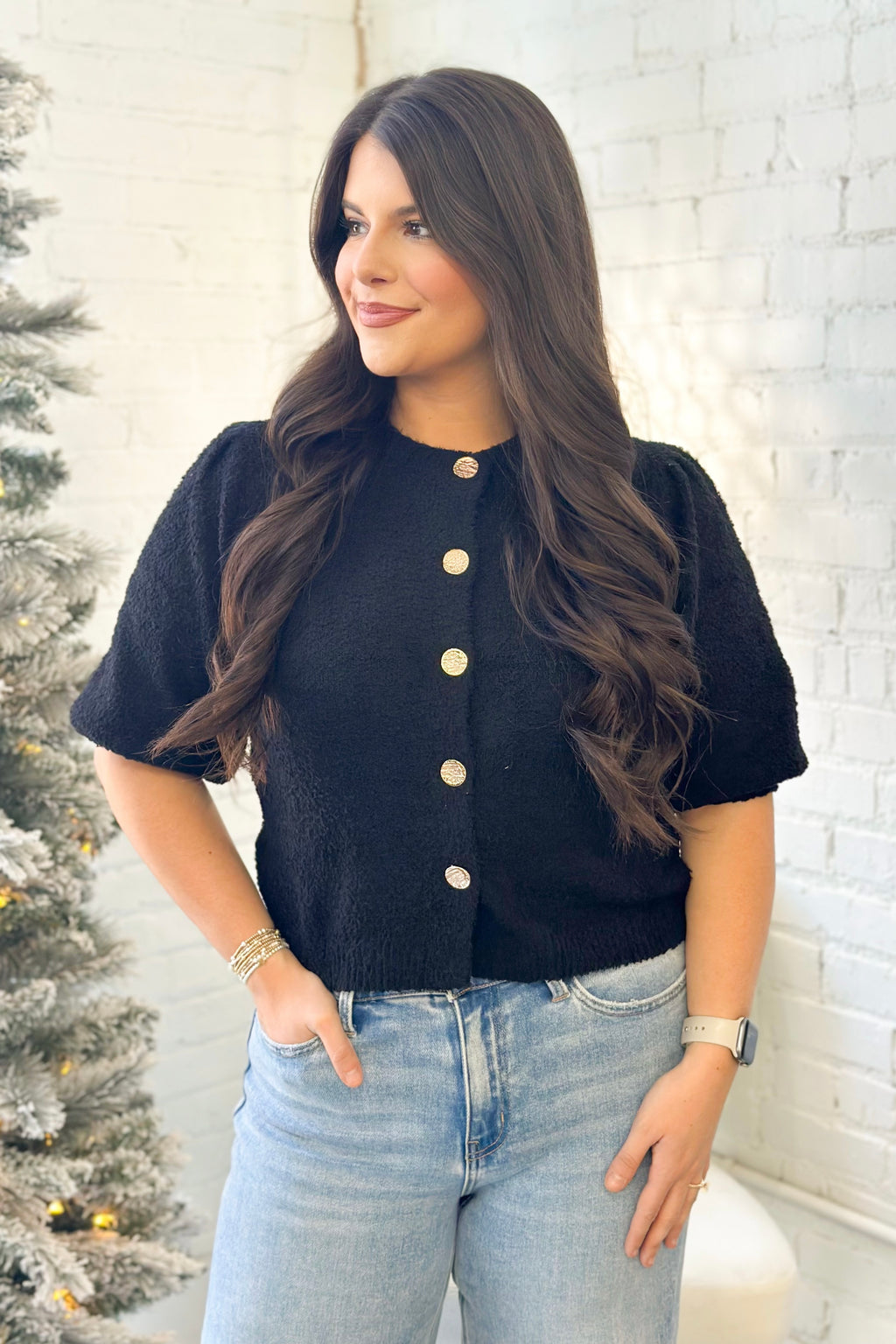 Black Short Sleeve Button Down Sweater Top