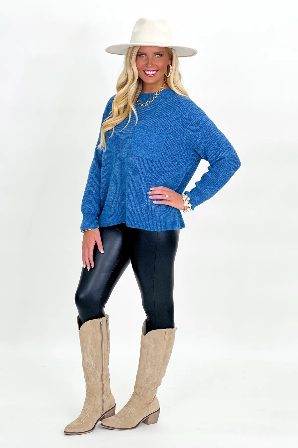 Blue Textured Front Pocket Long Sleeve Sweater