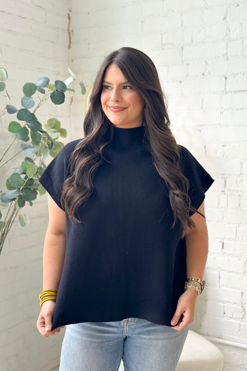 Black Mock Neck Cap Sleeve Sweater Top