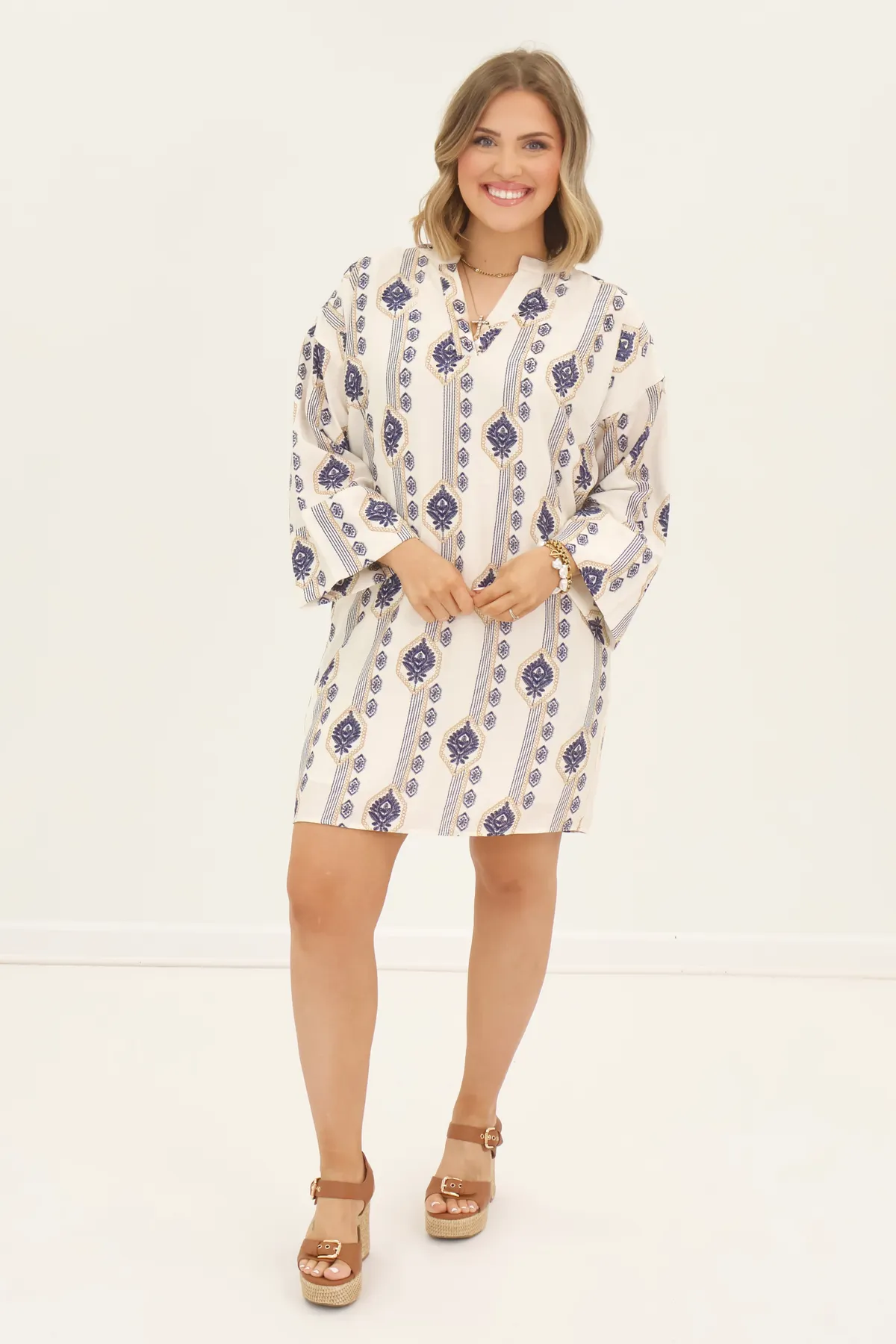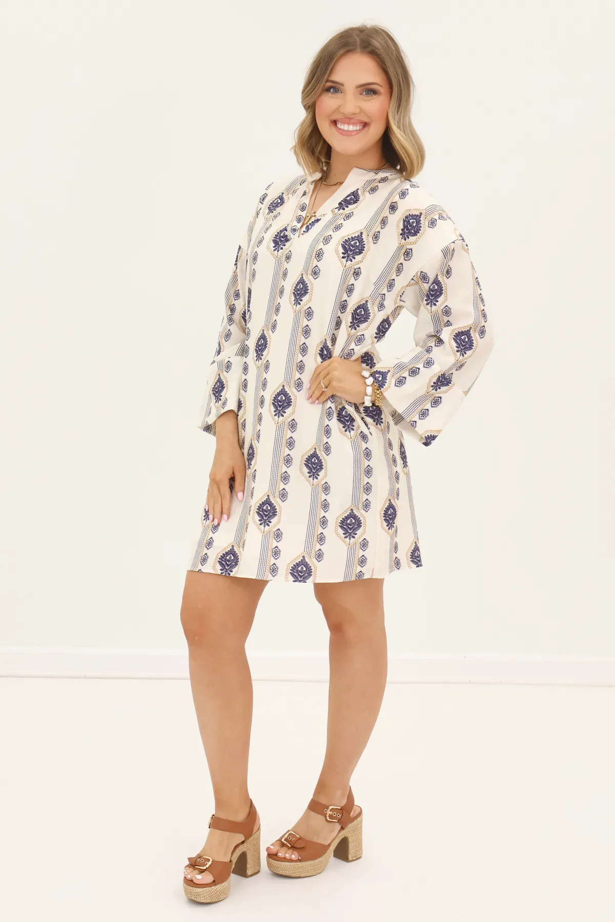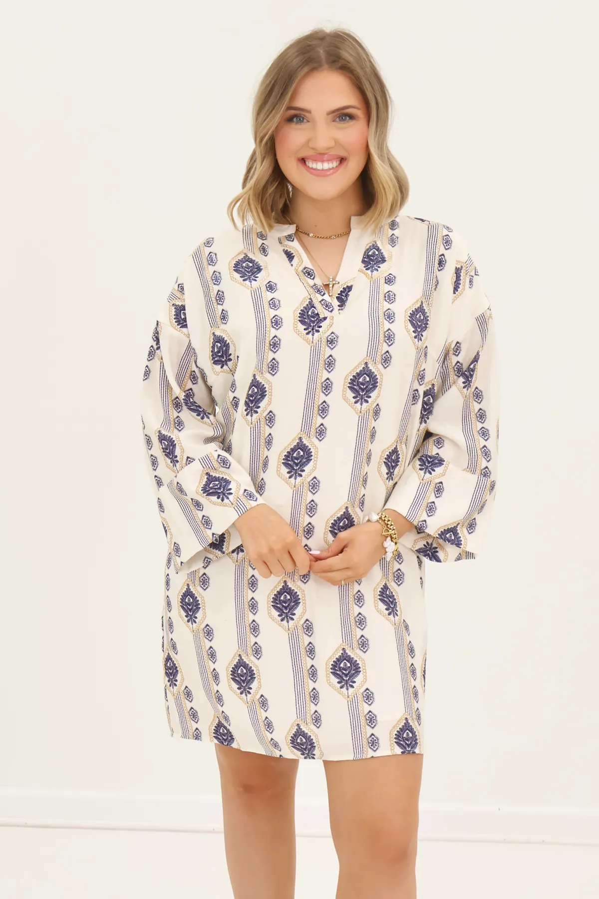 Off White and Navy Split Neck Dress