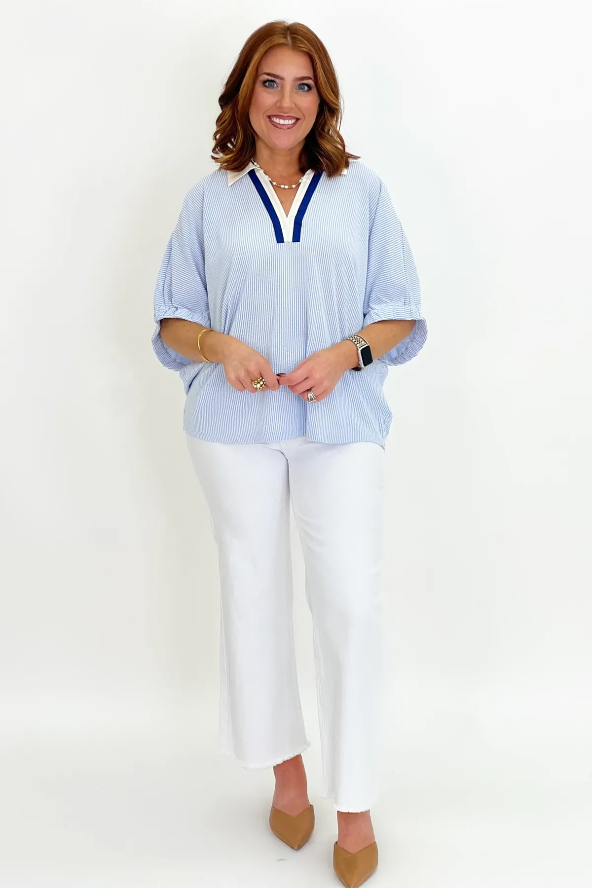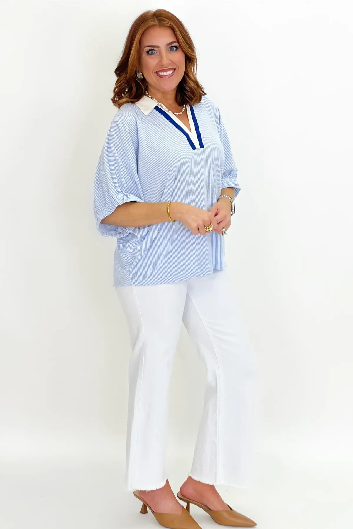 Blue Collared Scrunch Sleeve Top