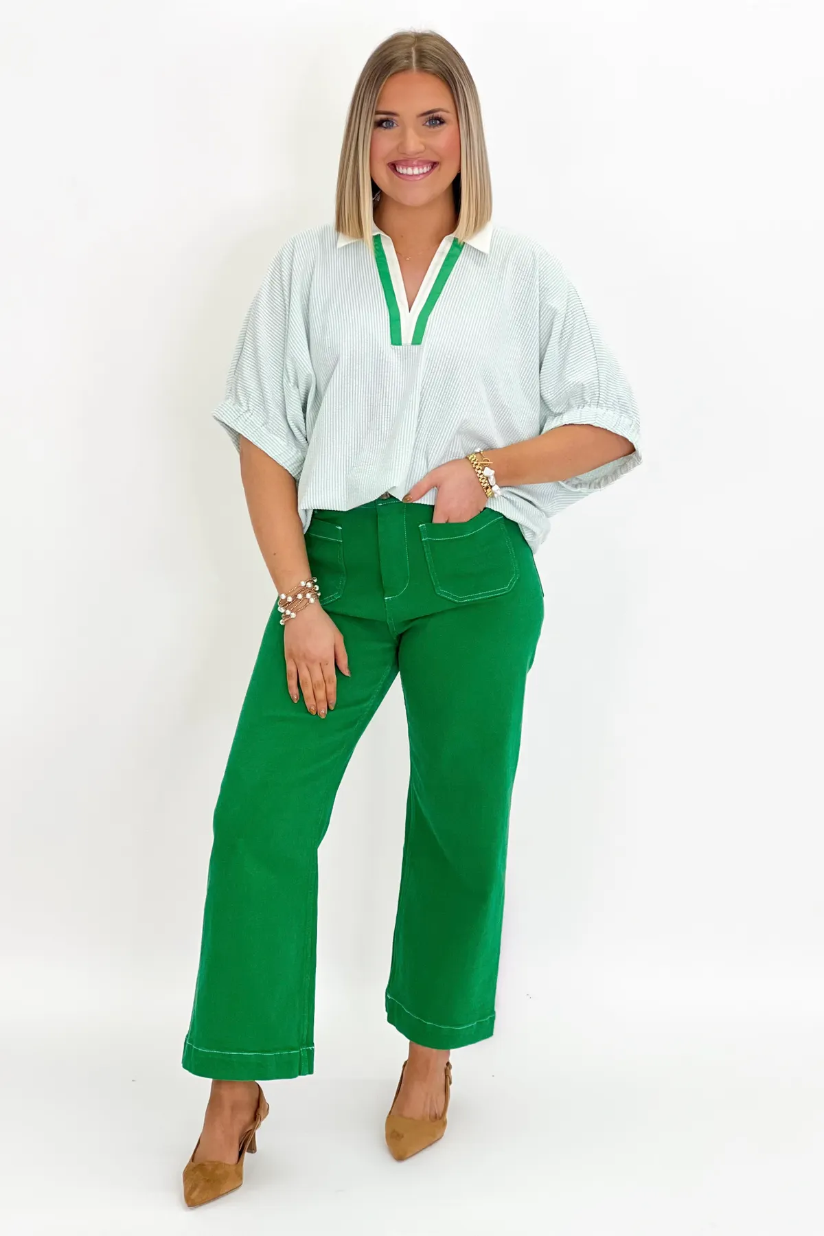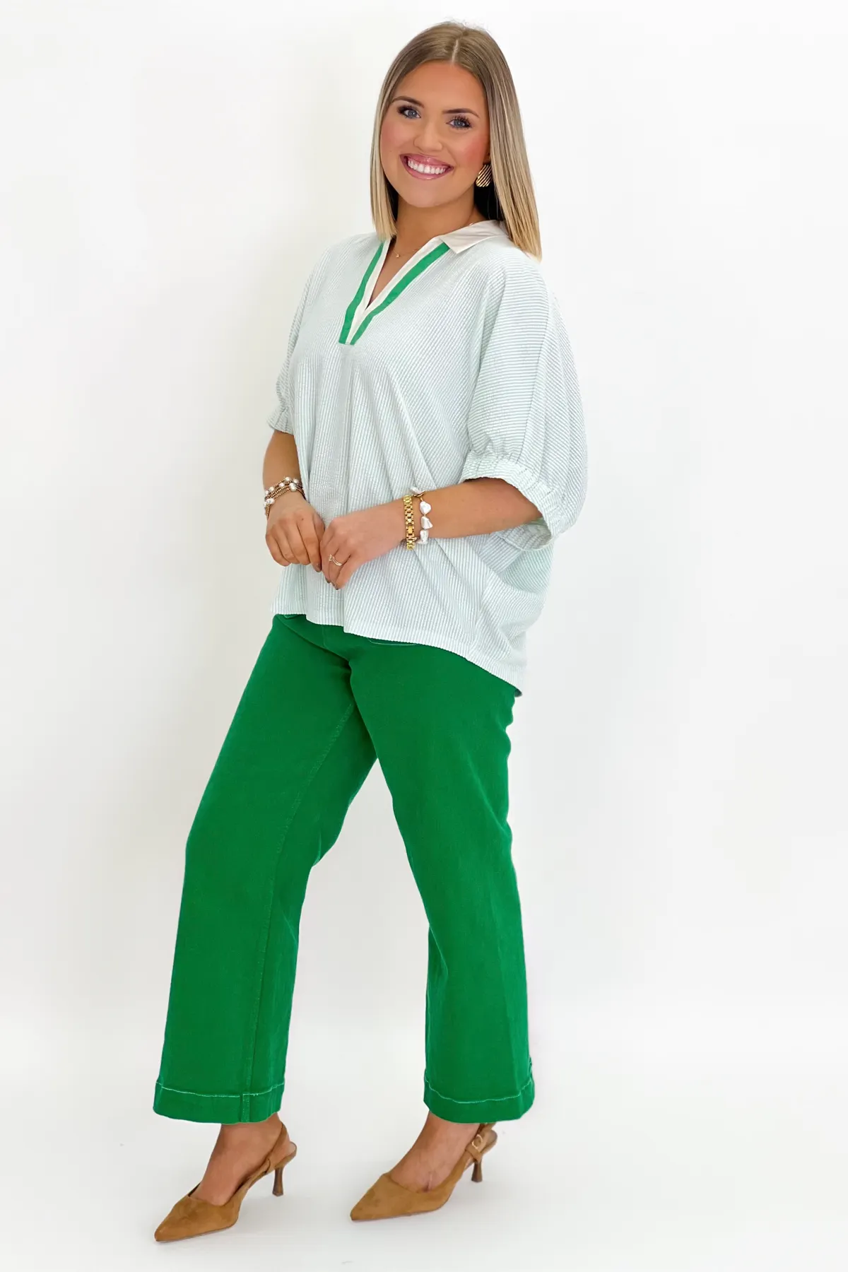 Green Collared Scrunch Sleeve Top